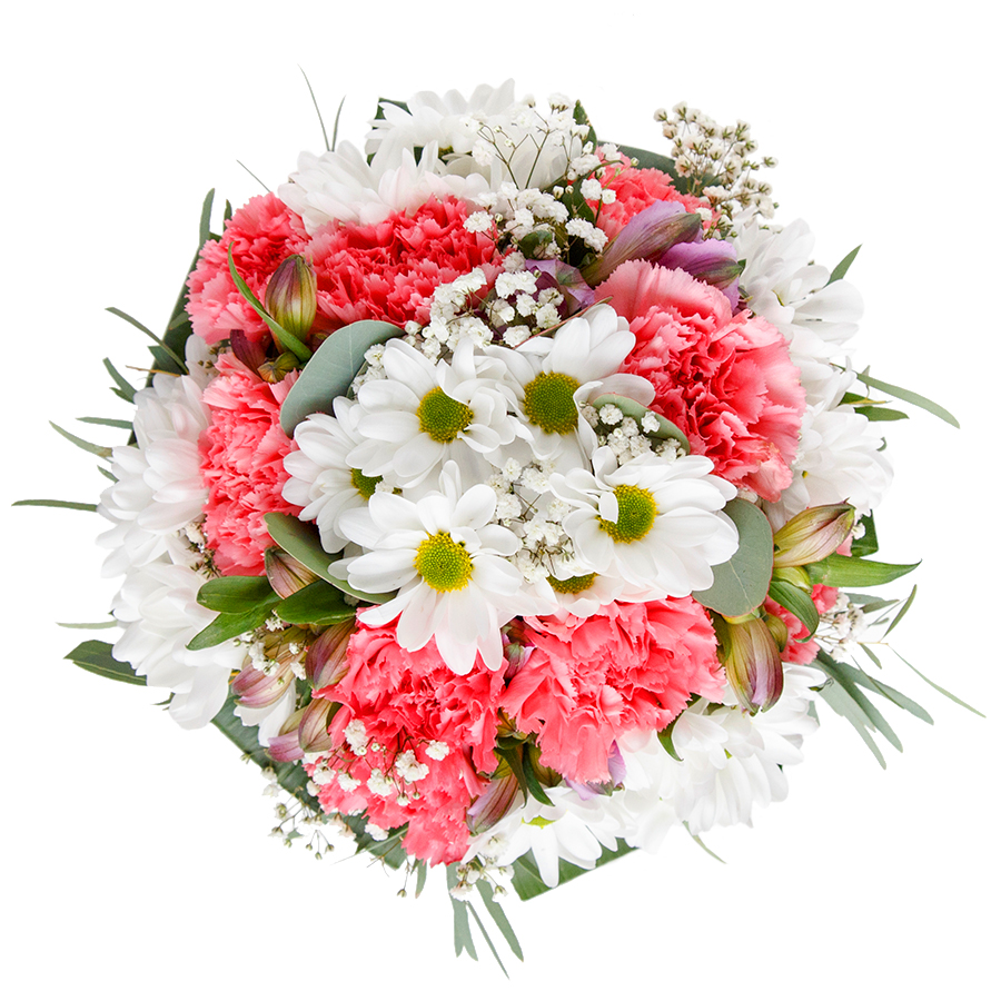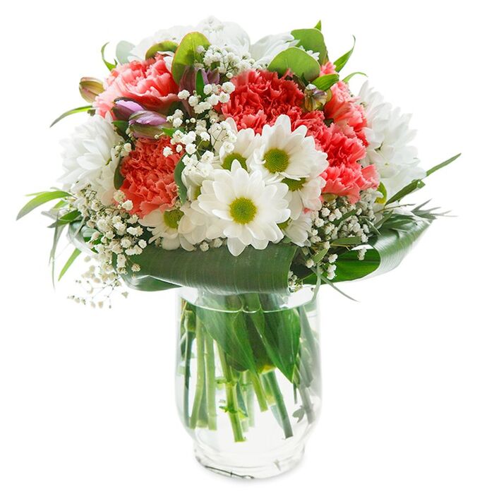 A splash of spring energy, this radiant bouquet from St John's Wood Flowers is gathered into a crisp white gift bag that promises both surprise and delight. Coral and vivid red carnations play the lead role, each bloom ruffled and lush, unfurling layers like laughter on a sunny day at Lord's cricket ground. White daisies, punctuated with bright green centers, bring a light-hearted contrast, their petals sparkling as if caught in morning light drifting through St John's Wood's leafy streets. Wispy sprays of baby's breath swirl throughout the bouquet, their petite blossoms lending innocence and a cloud-like softness to the arrangement. On one side, tiny purple-tinged buds rest quietly, suggesting stories still to unfold. Surrounding all, a flourish of deep green, shiny foliage wraps the base, gathering the flowers with a sense of both order and abundant joy. The bouquet's round, overflowing shape tells of expert hands and a love for making ordinary days exceptional. Set within the structured white bag with strong ribbon handles and shown against a pure white backdrop, it's an invitation to celebration, cheer, and genuine local warmth-ideal for birthdays, heartfelt thank-yous, or welcoming a new neighbour on Grove End Road. This radiant bouquet from a trusted St John's Wood florist captures the joyful promise of spring through a medley of fresh blooms and soft textures. At its core, dainty white daisies, each with a vibrant lime-green heart, are encircled by plush, coral-pink carnations whose ruffled edges glow in the light-evoking the energy of morning markets near Lord's Cricket Ground. Ethereal clouds of baby's breath peek between the main blossoms, infusing the arrangement with a dreamy lightness that seems to float above a rounded bed of lush, deep-green foliage and matte eucalyptus sprigs. Interspersed throughout are slender alstroemeria buds touched with blush and plum, lending an elegant accent and hinting at blooms yet to unfold. The bouquet's balanced, circular shape reflects the symmetry and poise beloved by St John's Wood residents, while its palette is uniquely uplifting-perfect for birthdays, heartfelt congratulations, or simply adding a dash of springtime cheer to a high street home or office. Hints of fresh, uplifting fragrance and a gentle optimism imbue the arrangement, showcasing both the talent of St John's Wood florists and the enduring vitality of British flowers. Available for local delivery, it is a heartfelt tribute to celebration and renewal in NW8. Overflowing with cheerful freshness, this St John's Wood floral creation brings together plush, coral-pink carnations arranged as a lively focal point surrounded by snowy white daisies and multi-petaled chrysanthemums with gleaming yellow-green centers. Wispy sprigs of baby's breath weave a soft, cloudlike veil between the larger blooms, diffusing colour and adding a delicate sense of depth. On one side, deep magenta alstroemeria buds rest tightly closed, hinting at flowers soon to open and enriching the composition with a touch of mystery. The base is cocooned in lush, glossy green leaves as well as slender leafy stems, drawing inspiration from the greenery tucked beneath nearby park canopies. All are held in a sparkling clear vase, water glistening around the exposed stems-an emblem of purity and vitality. Illuminated in gentle natural light, the arrangement's lively hues, intricate textures, and organic silhouette are shown to full effect. This bouquet feels at once uplifting and reassuring-perfect for a birthday surprise in a villa off Abbey Road, a note of thanks to a neighbour, or simply bringing a moment of beauty and optimism into a St John's Wood home.